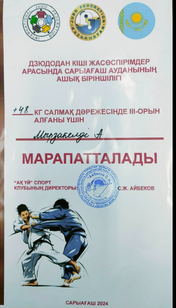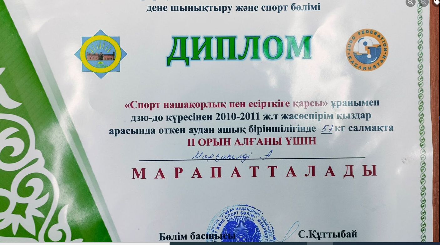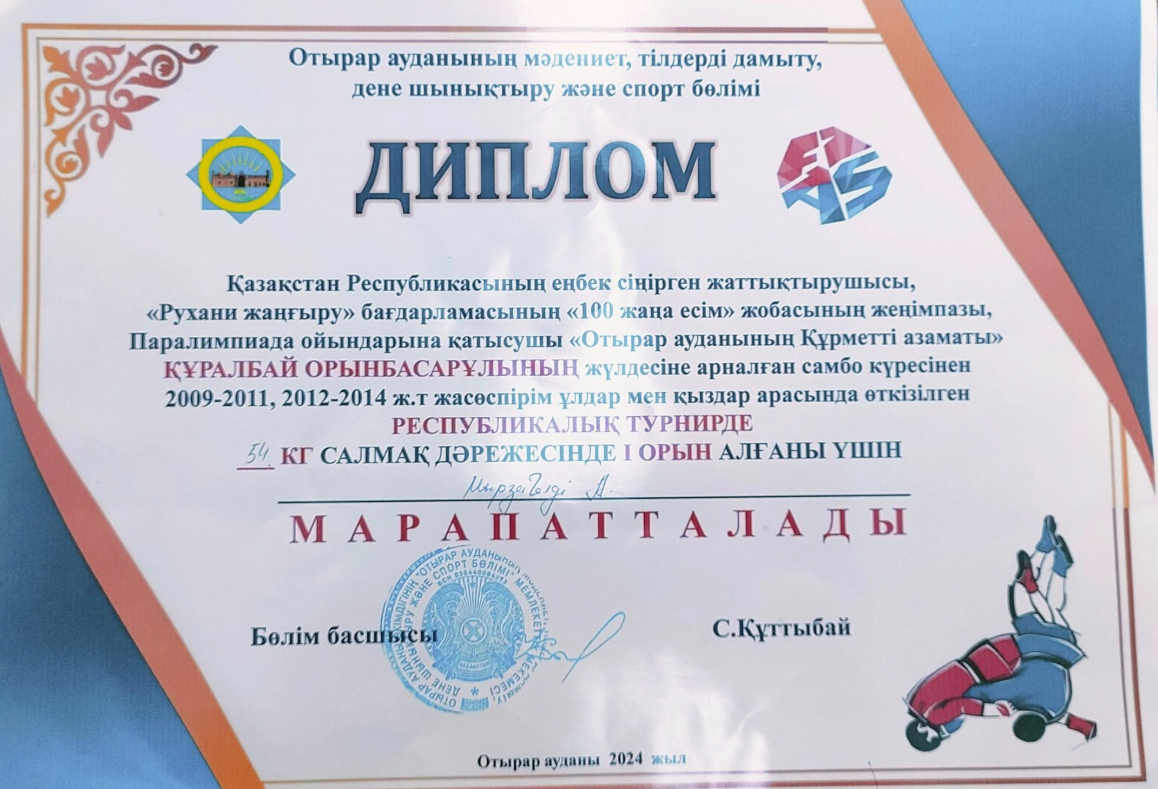 Арыс қаласы білім бөліміне қарасты «Арыс жалпы білім беретін мектеп» КММ-нің 8 сынып оқушысы Мырзагелді Ақнұр ҚР еңбек сіңірген жаттықтырушысы, «Рухани жаңғыру» бағдарламасының «100 жаңа есім» жобасының жеңімпазы Құралбай Орынбасарұлының жүлдесіне арналған самбо күресінен ұлдар мен қыздар арасында өткізілген республикалық турнирде 54 кг салмақ дәрежесінде 1 орын алғаны үшін марапатталды.