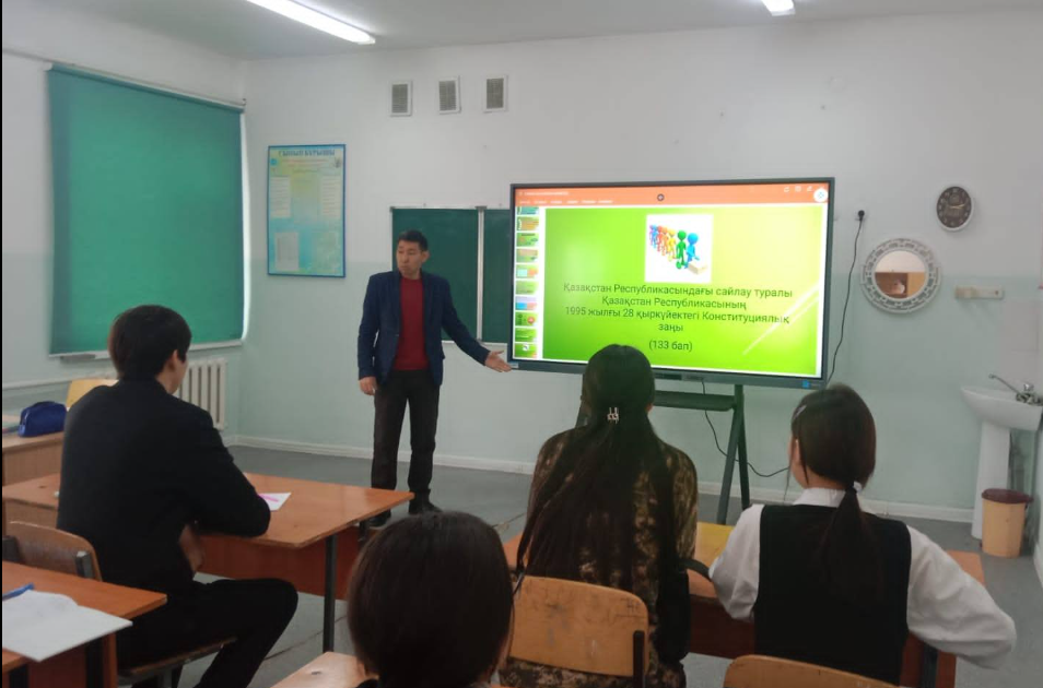 Арыс қаласының «Білім бөлімі» мемлекеттік мекемесіне қарасты, «Арыс жалпы білім беретін мектеп» коммуналдық мемлекеттік мекемесінде №14 сайлау учаскесінің хатшысы Е.Шекеровтың ұйымдастыруымен «Дүниежүзілік сайлау күні» тақырыбында 11 сынып оқушыларына сынып сағаты өткізілді.