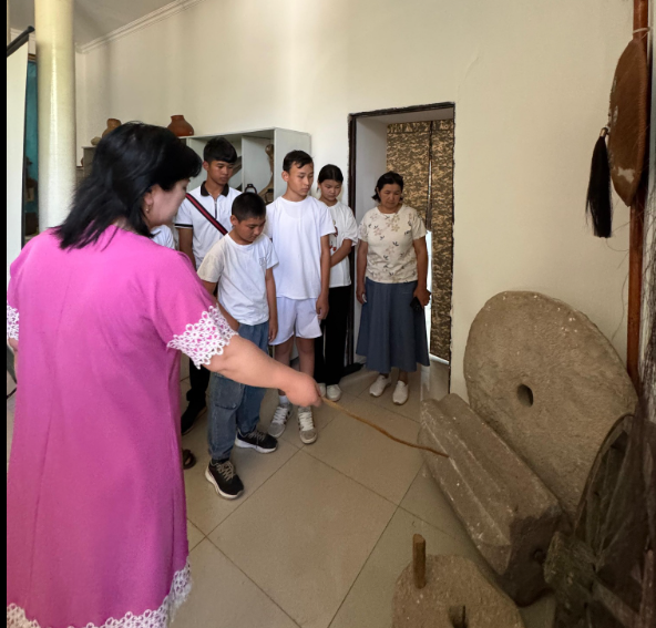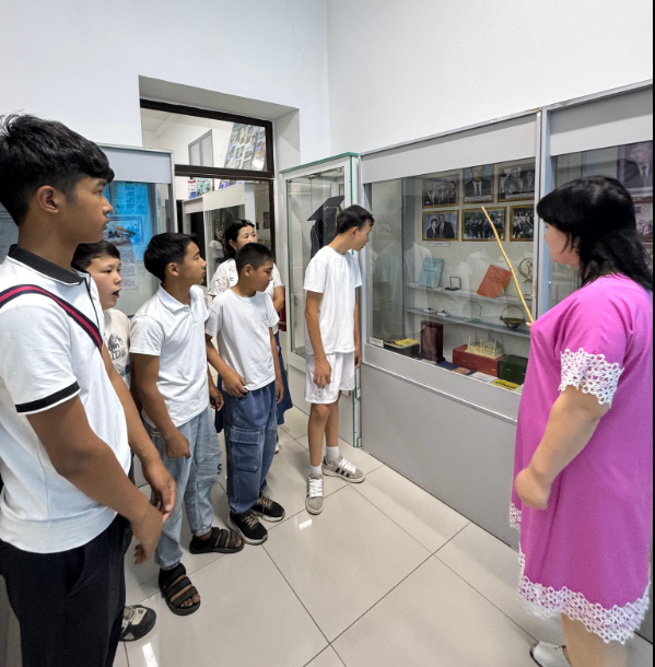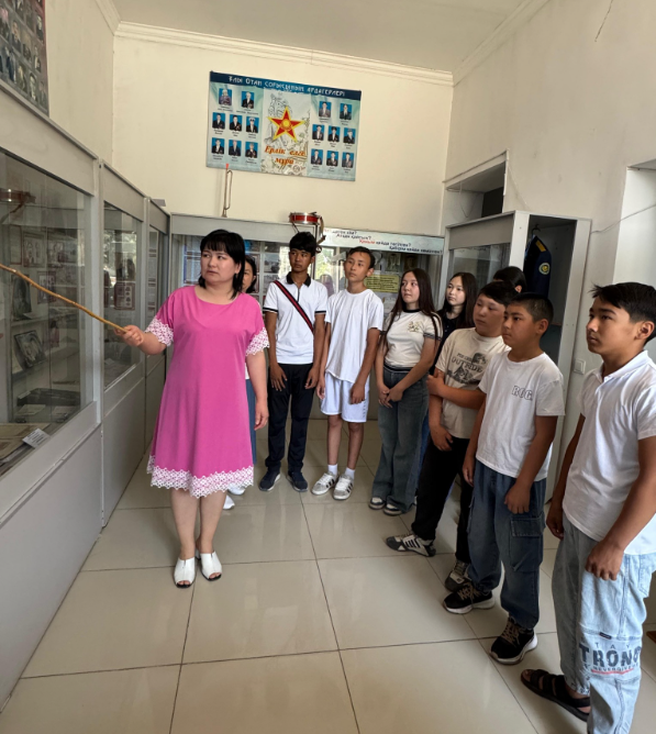 Арыс қаласының мұражай экскурсаводы Садықова Мейрамкүл Нұрбергенқызы оқушыларға Арыс қаласынан шыққан еңбек ардагерлері, еңбек әулеттерінің жетістіктері мен табыстары жайында және мұражайдағы жәдігерлермен таныстырып шықты