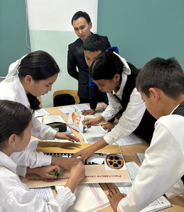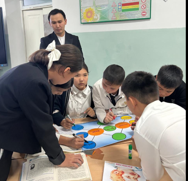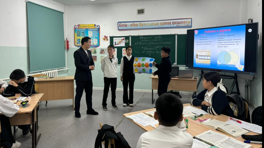 Л.Н. Толстойдың «Кавказский пленник» әңгімесі бойынша топтық жұмыс ұйымдастырылды. Бірінші топқа «Кинолента» әдісі арқылы суреттерді ретімен қойып, қысқаша әңгімеледі. Екінші топ «Двойной пузырь» әдісі арқылы басты кейіпкерлердің қасиеттерін және ортақ ұқсастықтарын жазып, айтып берді. Саралау тапсырмалары беріліп, оқушылар жеке тапсырмалармен жұмыс жасады. Сабақта әдіс-тәсілдер тиімді қолданылып, мұғалім мен оқушылар тарапынан бағалау дер кезінде жүргізілді, кері байланыс берілді. Сабақ мақсатына жетті.