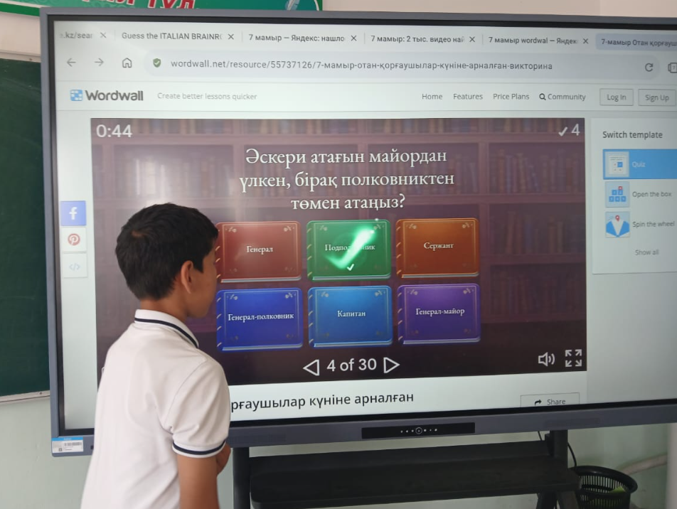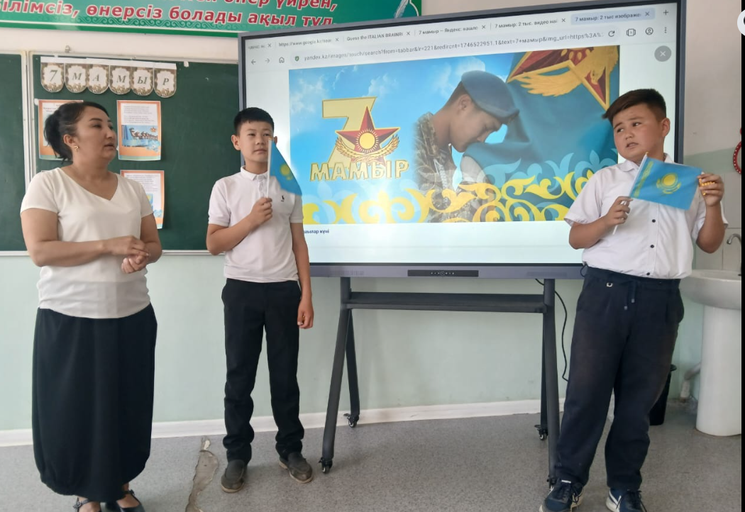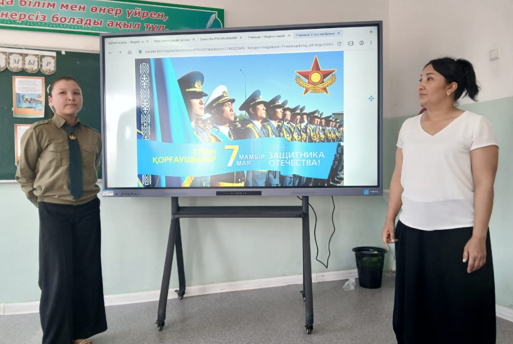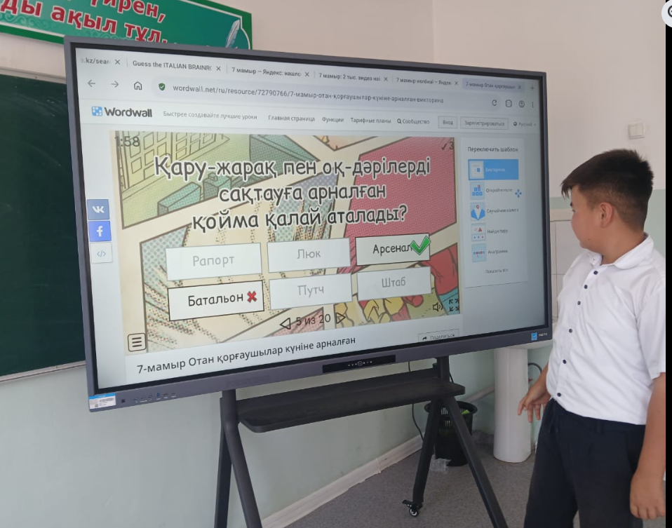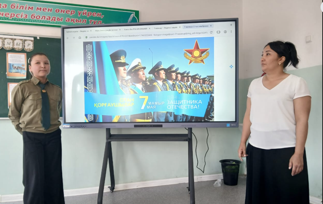"Арыс жалпы білім беретін мектеп" КММ 7 "В" сынып жетекшісі Сатымбекова Гулдариға сынып оқушыларымен 7 мамыр - Отан қорғаушылар күніне орай, " Ұранды ердің - ұрпағы қайсар " тақырыбында сынып сағаты өтті. Мақсаты: Оқушыларға Ұлы Отанды сүюге, ерлік көрсеткен батырлардың бойындағы ержүректілік, отан сүйгіштік, ұлтжандылық қасиеттерін дәріптеу. Отанын, елін қорғай білуге тәрбиелеу. Мағынаны ашуда Wordwall плпатформасында тапсырмалар орындады. Оқушылар Отан, Тәуелсіздік тақырыптарына өлең шумақтарын мәнерлеп оқыды.