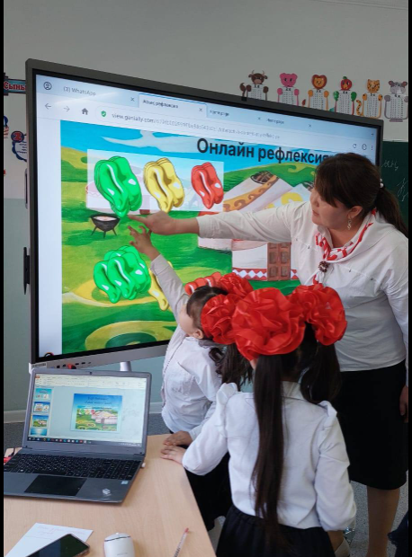 Үй тапсырмасын "World wall "жасанды интелектті пайдалана отырып бекітті. Жаңа сабақты "Болжау" әдісімен ашты. Оқушылар сабақтың тақырыбын болжап, әңгімеледі. Жұптық жұмысты "Тәуелсіз Қазақстан" елінің негізгі белгілерін кластер құру арқылы жазып көрсетті. Жеке жұмыспен "Сәйкестендіру" сызбасын орындады. Оқушыларды асық жинау арқылы бағалап отырды. Сабақты